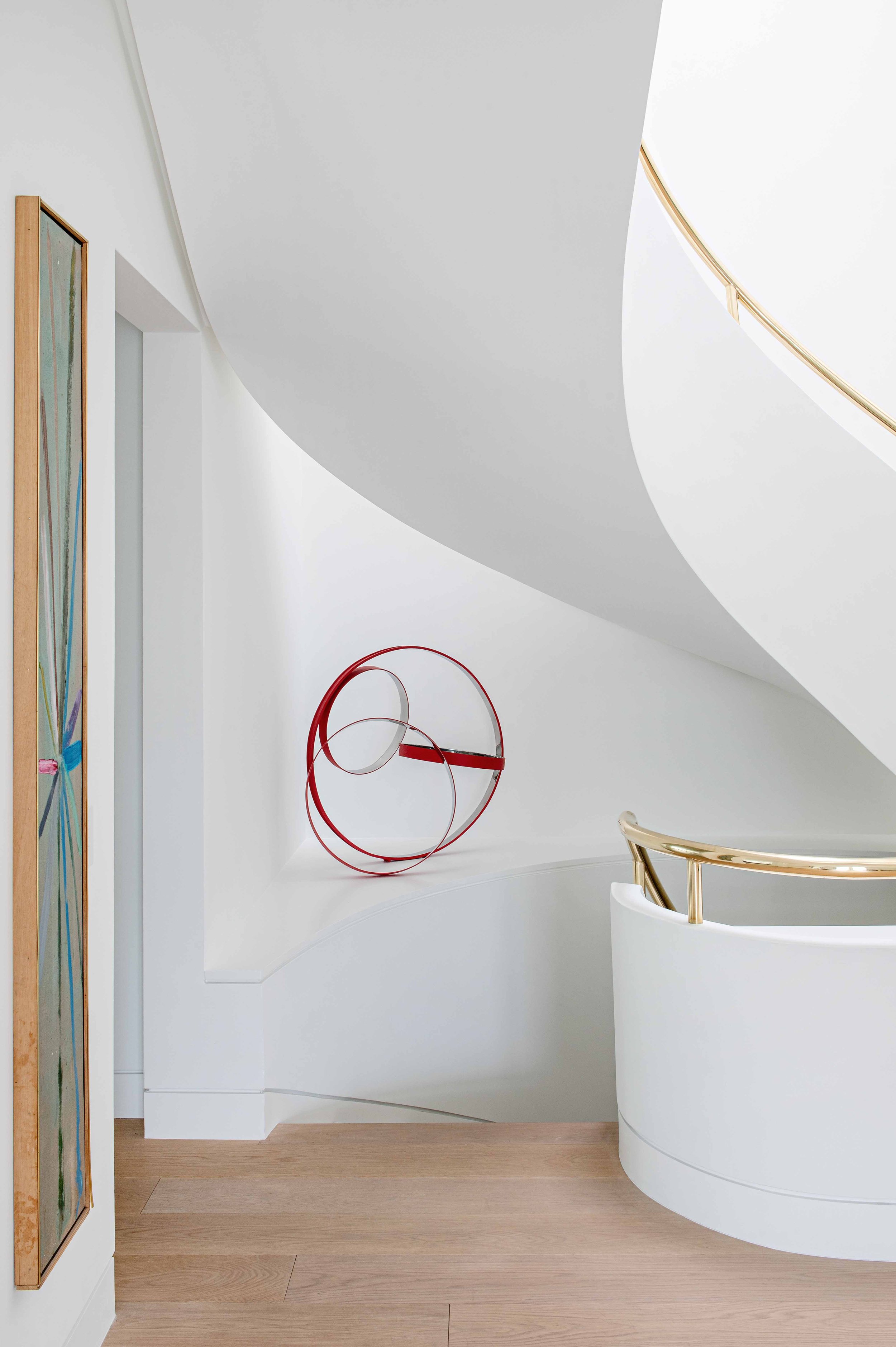 The project's design language, inspired by the existing staircase's sweeping lines, embraces a curvilinear theme throughout. The renovation achieves a delicate balance between preserving the home's character and meeting the clients' desire for a refreshed and refreshing functional space.